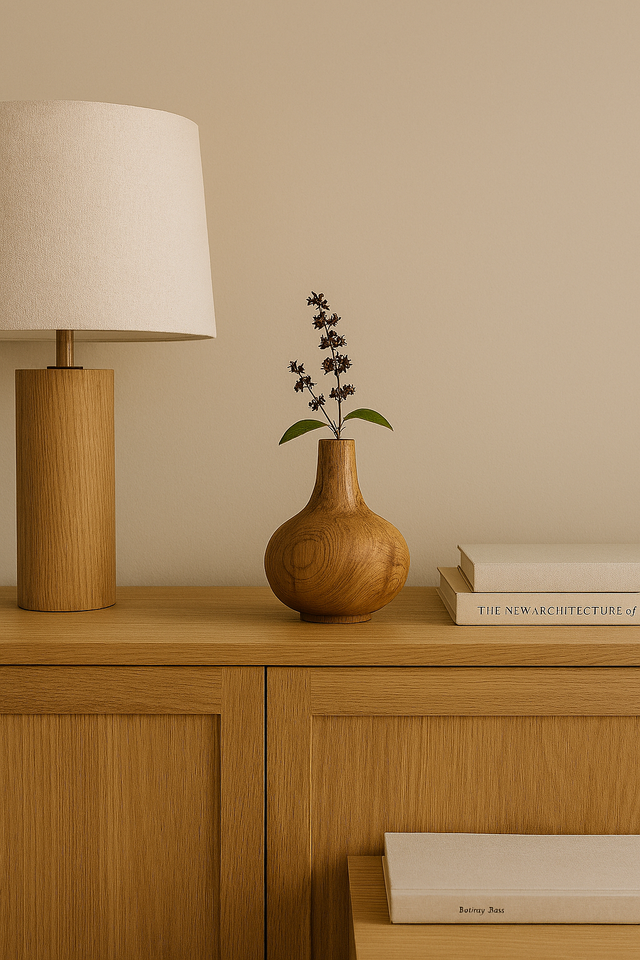 Made from solid Oak and finished with splashproof oils, every vase includes a glass insert making it suitable for a few statement fresh stems, dried arrangements or simply as a sculptural piece for the home. Whether styled with botanicals or displayed on its own, this vase adds warmth and character to any space.