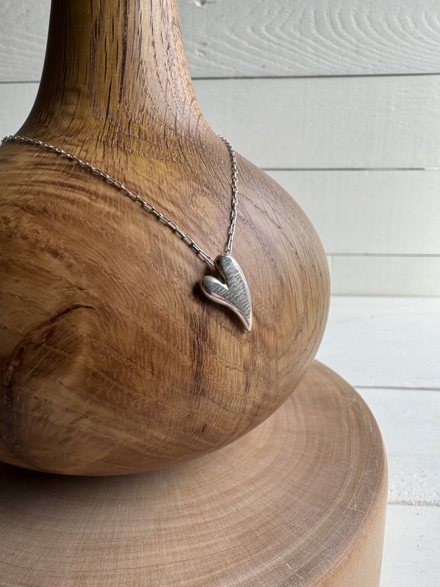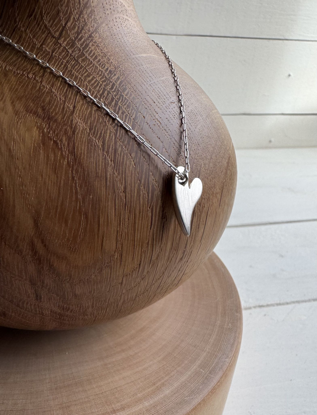 Elegant and understated, this handcrafted heart necklace is made from solid Sterling silver and designed to complement any outfit. Featuring a modern silhouette, the pendant is finished with a distinctive bark-like texture and a subtle satin sheen that catches the light beautifully.